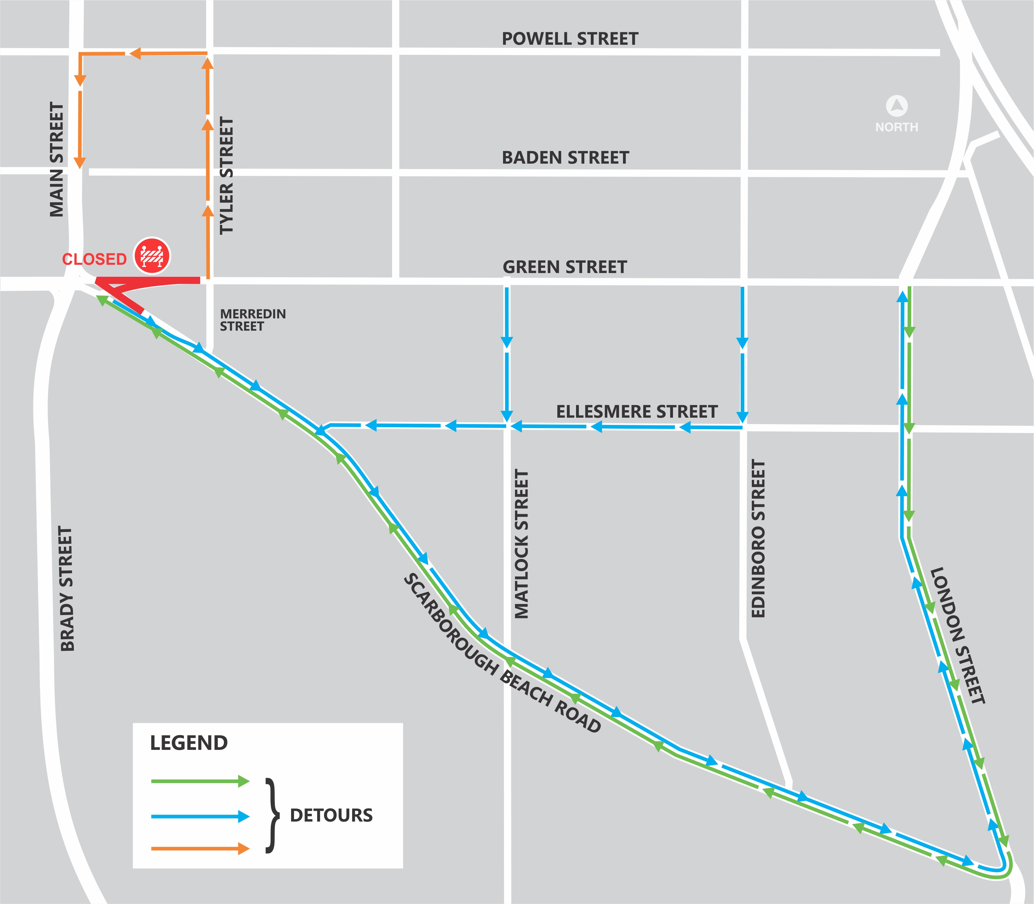 This closure will be in place 24/7 for approximately two weeks, with detours in place as illustrated below. Local access will be maintained for Bauxite Lane and Waterloo Street via Baden Street.