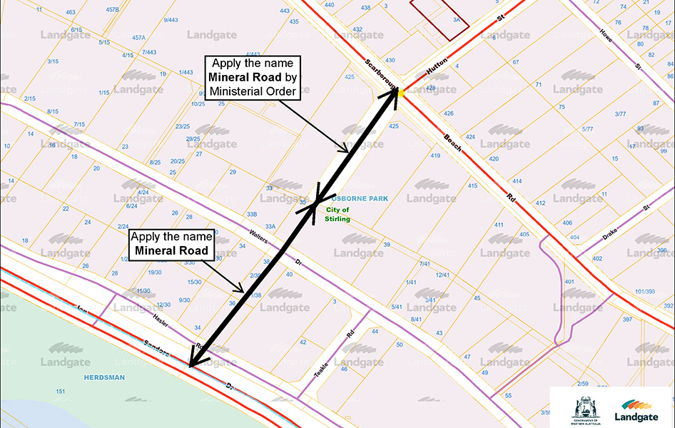 In June 2024, the road south of Scarborough Beach Road was named Mineral Road. Please refer to the map below for the extent of Mineral Road.