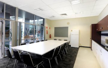 The meeting room contains an interactive whiteboard, a whiteboard with a retractable screen and air conditioning with heating and cooling options overlooking a spacious courtyard.