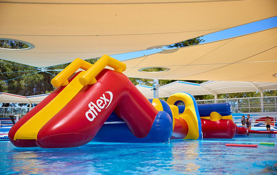 The inflatable is suitable for children 6 years and older who are able to swim 25 metres in deep water. Slip, slide and laugh while you negotiate your way along the inflatable for massive amounts of fun and entertainment. Children 12 years and under must be accompanied by a supervising adult (16 years or older). Parents are still required to maintain supervision. Please note, alcohol and glass are prohibited in the facility.