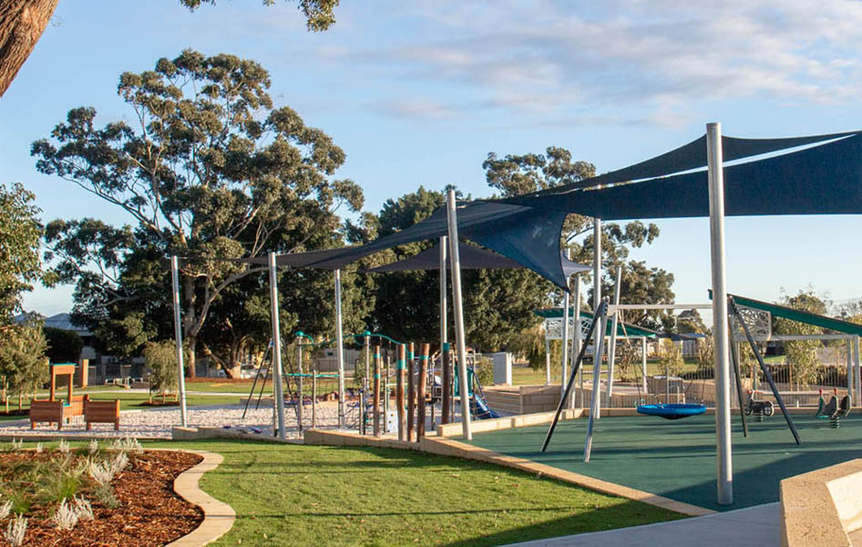 The playspace at Robinson Reserve features a combination of spaces. There are three shelters including an extra large shelter, BBQ, accessible public toilets, accessible picnic tables, beginner skate area and basketball half-court. An accessible path network circulates the reserve.